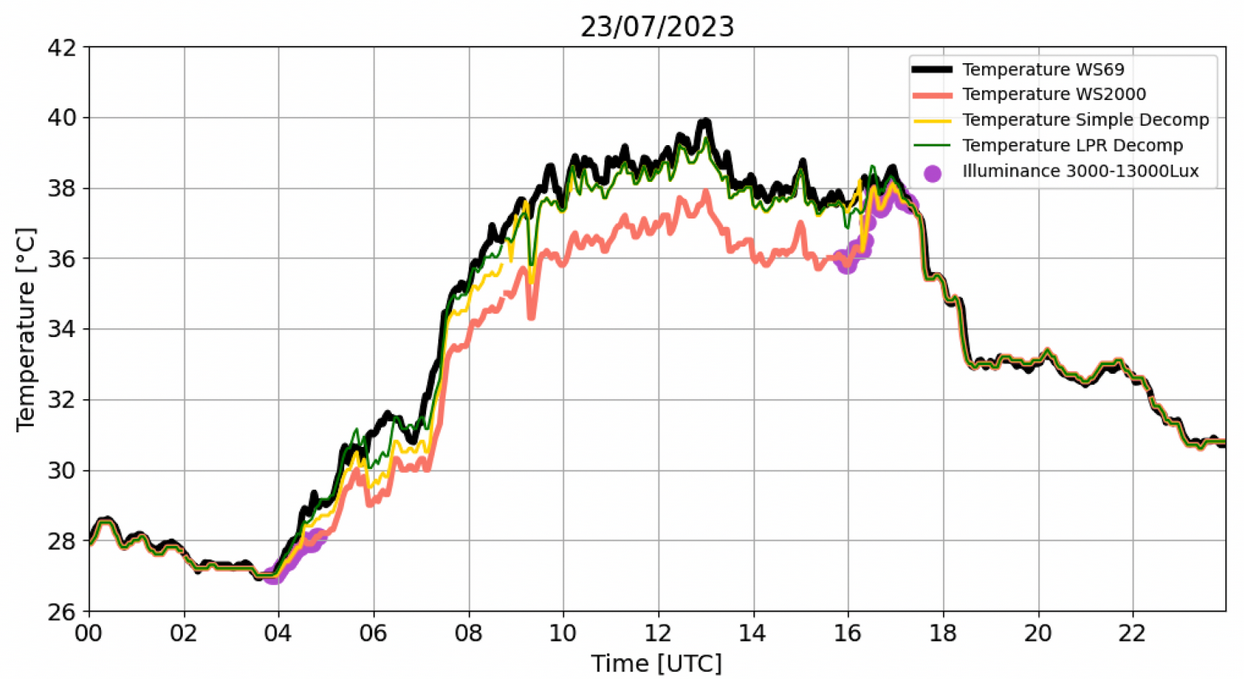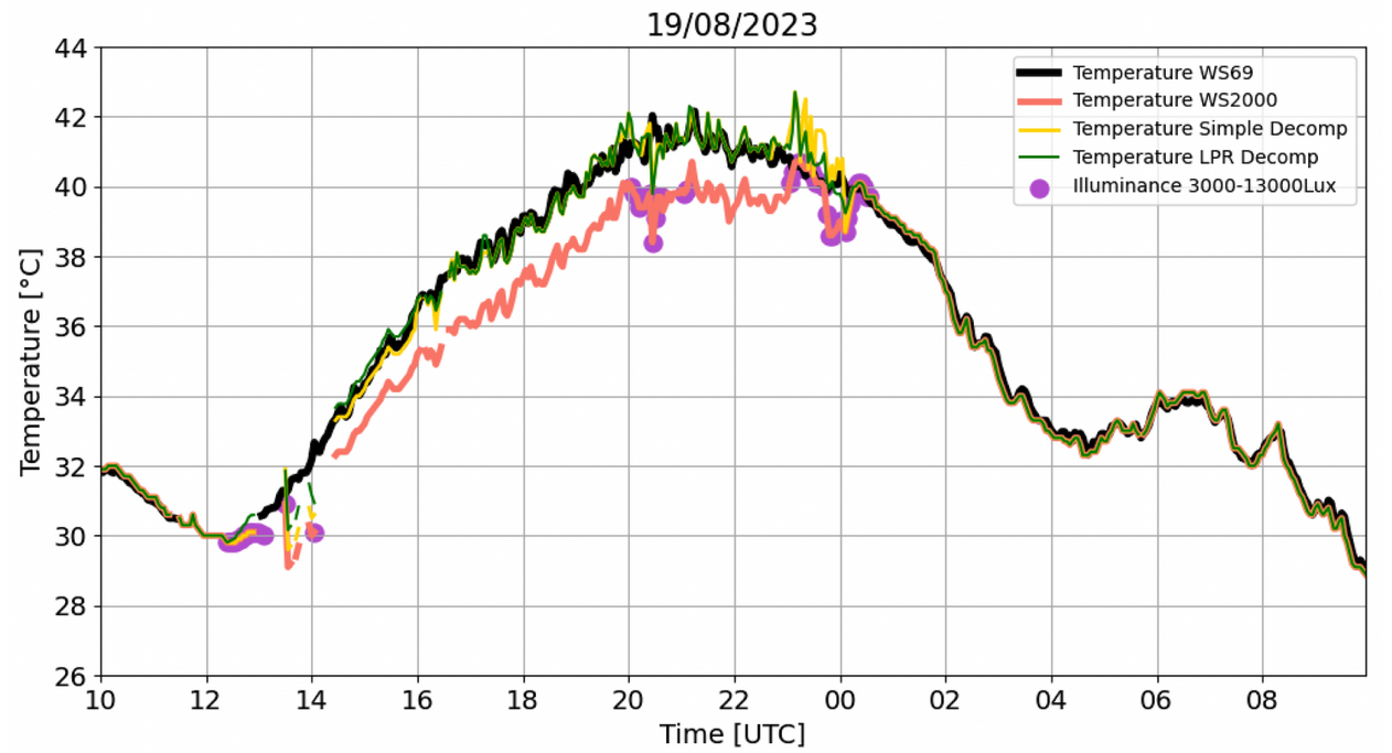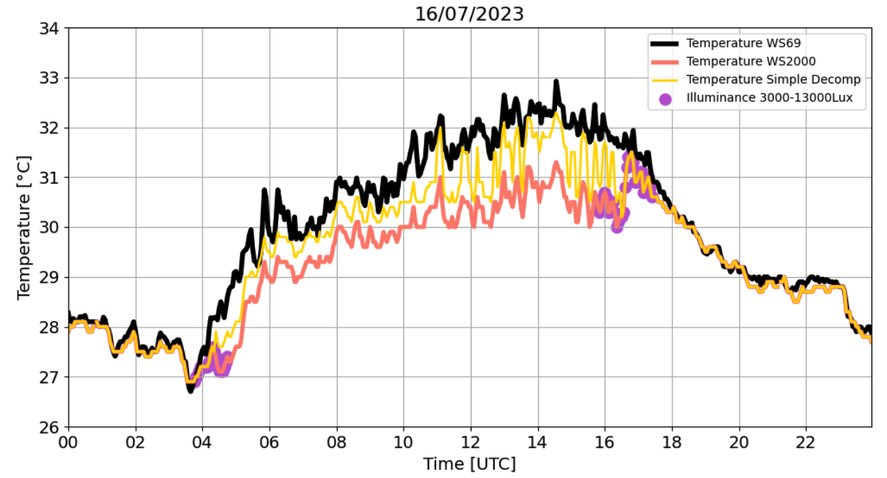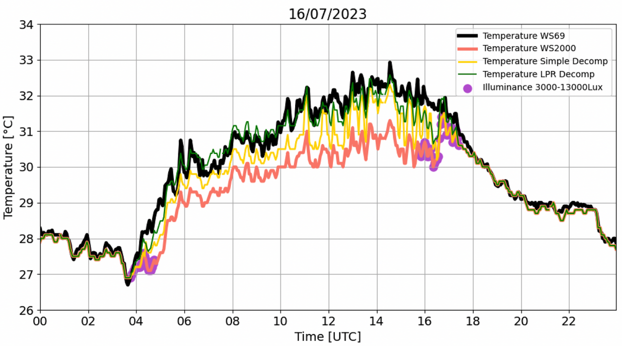 Figure 2. Temperature on 16/07/2023 recorded by TS_1 WS69 (black), WS2000 (red) weather stations. The WS69 is considered as the reference. The Simple Decompensation (yellow) and LPR approaches are also shown. Purple dots indicate the period of the day that illuminance is between 3000-13000Lux. RMSESimple_Decomp = 0.72°C, TmaxSimple_Decomp = 32.3°C, RMSELPR = 0.53°C, TmaxLPR=32.6°C, TmaxLWS69R = 32.9°C.