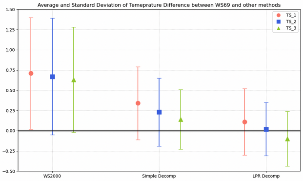 Figure 5. Summarisation of the results of Table 6. Markers indicate the average difference of mean temperature between WS69 and WS2000, simple decompensation and LPR methods (for WS69 temperature <25.5°C), while the error bars depict the corresponding standard deviation.