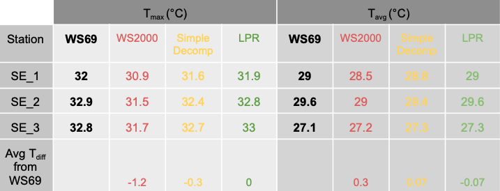 Then, we wanted to investigate the differences in Tmax and Tavg to show the significance of the issue (Table 5). The initial compensated WS2000 daily maximum temperature (Tmax) presented ~1.2°C deviation from WS69 temperature. While the simple decompensation dropped this difference to 0.3°C by the simple decompensation, the LPR eliminated this difference (0°C). Regarding the Tavg, the differences are lower (as temperatures <25.5°C are involved in the calculations). However, both Simple Decompensation and LPR eliminate the difference from WS69.